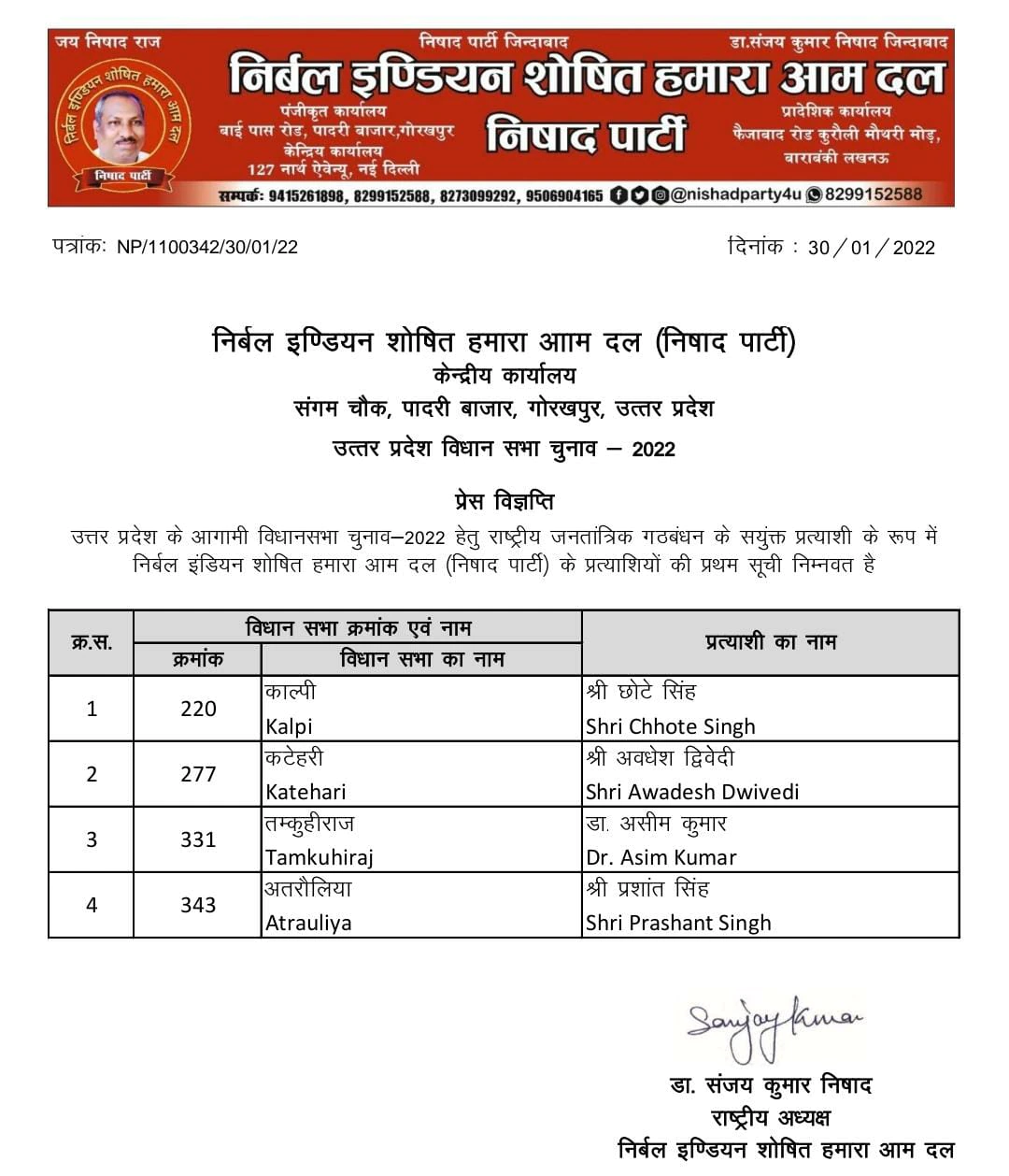 जारी लिस्ट के मुताबिक, कालपी विधानसभा सीट से छोटे सिंह, कटेहरी से अवधेश द्विवेदी, तमकुहीराज से डॉक्टर असीम कुमार और अतरौलिया से प्रशांत सिंह को पार्टी ने प्रत्याशी बनाया है।