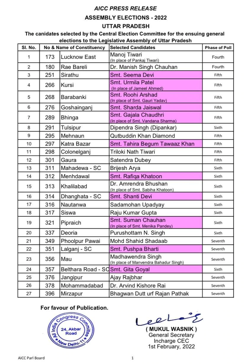 इसके अलावा, पार्टी ने खलीलाबाद विधानसभा क्षेत्र पर भी बदलाव करते हुए सबीहा खातून का टिकट काटा है और डॉ. अमरेंद्र भूषण को उम्मीदवार बनाया है. साथ ही पिपराइच सीट से मेनिका पांडेय की जगह सुमन चौहान पर मुहर लगाई है. वहीं, मऊ सीट से मानवेंद्र बहादुर सिंह के स्थान पर माधवेंद्र सिंह को पार्टी कांग्रेस ने अपना प्रत्याशी बनाया है। इस लिस्ट में कांग्रेस ने 27 उम्मीदवारों के नाम की घोषणा की है जो कि यूपी में चौथे, पांचवें, छठे और सातवें चरण में चुनाव लड़ेंगे।