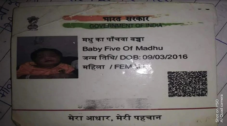 ‘मधु का पांचवां बच्चा’ लिखा आधार कार्ड सोशल मीडिया पर भी वायरल हो गया. बिल्सी तहसील क्षेत्र के गांव रायपुर का रहने वाले दिनेश के 5 बच्चे हैं. उनके तीन बच्चे गांव के ही प्राथमिक विद्यालय में पढ़ते हैं. दिनेश अपनी बेटी आरती का एडमिशन कराने विद्यालय पहुंचा तो वहां मौजूद शिक्षिका एकता वार्ष्णेय ने नामांकन की सभी औपचारिकताओं को पूर्ण करते हुए जब बच्ची का आधार कार्ड देखा तो हैरान रह गईं. आधार कार्ड में बच्ची आरती के नाम के स्थान पर ‘मधु का पांचवां बच्चा’ लिखा हुआ था.