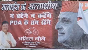 सपा कार्यालय के बाहर जो पोस्टर लगाया गया है, इसे महराजगंज जिला के सपा नेता अमित चौबे ने लगाया है. इस पोस्टर में अखिलेश यादव को सत्ताईस का सत्ताधीश बताते हुए लिखा है- न बंटेंगे, न कटेंगे, PDA के संग रहेंगे. बता दें कि सीएम योगी लगातार अपनी सभाओं में नारा देते रहे हैं- कटेंगे तो बंटेंगे. सपा नेता अमित चौबे जिले की फरेंदा सीट से सपा की टिकट के लिए दावेदारी कर रहे हैं. इस पोस्टर के जरिए सीएम योगी के नारे का पलटवार करते हुए मैसेज देने की कोशिश की गई है कि पीडीए वोटबैंक लोकसभा चुनाव की तरह इस बार भी एकजुट रहेगा और वो समाजवादी पार्टी को सपोर्ट करेगा.