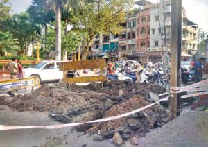 इन्दौर (Indore)। मध्य क्षेत्र के इलाकों की हालत बदतर है और ड्रेनेज लाइनों के लिए जगह-जगह सडक़ें खोदी जा रही हैं। कल देर रात राजबाड़ा महालक्ष्मी मंदिर के सामने ड्रेनेज के लिए सडक़ खोद दी गई तो वहां रहवासी जमा हो गए और हंगामा शुरू हो गया। रहवासियों का कहना था कि बड़ी संख्या में श्रद्धालु आते हैं और यह क ार्य नवरात्रि में ही क्यों किया जा रहा है। इस पर स्मार्ट सिटी के अधिकारियों ने वहां दस दिनों के बाद काम शुरू कराने की बात कही।