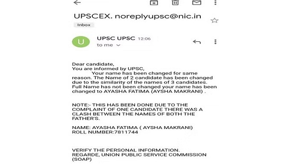 पहला ये कि आयशा मकरानी के एडमिट कार्ड में पर्सनालिटी टेस्ट की तारीख 25 अप्रैल लिखी थी और दिन गुरुवार बताया गया था। वहीं आयशा फातिमा के कार्ड पर भी पर्सनालिटी टेस्ट की तारीख 25 अप्रैल थी लेकिन दिन मंगलवार था। हकीकत में 25 अप्रैल को मंगलवार ही था। हालांकि आयशा मकरानी के भाई ने इस संबंध में दूसरे दस्तावेज भेजने का कहा। उन्होंने यूपीएससी की तरफ से आया मेल दिखाया। जिसमें लिखा था कि आपका नाम एक जैसे नाम होने के कारण बदल दिया गया है। तीन उम्मीदवारों के नाम में समानता होने के कारण दो उम्मीदवारों के नाम बदल दिए गए हैं। पूरा नाम नहीं बदला है आपका नाम आयशा फातिमा (आयशा मकरानी) में बदल दिया गया है।