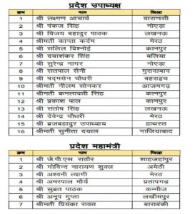 प्रदेश उपाध्यक्षों की सूची में लक्ष्मण आचार्य, पंकज सिंह, विजय बहादुर पाठक, कांता कर्दम, सलिल विश्नोई, दयाशंकर सिंह, सुरेंद्र नागर, सतपाल सैनी, पदमसेन चौधरी, नीलम सोनकर,कमलावती सिंह, प्रकाश पाल,संतोष सिंह, देवेन्द्र चौधरी, ब्रजबहादुर उपाध्याय, सुनीता दयाल हैं।