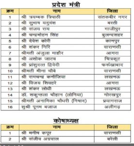 इनके अलावा प्रदेश उपाध्यक्ष में त्रयंबक त्रिपाठी, सुभाष यदुवंश, संजय राय, चंद्रमोहन सिंह, देवेश कोरी, शंकर गिरी, अंजुला माहौर, अशोक जाटव, प्रांशुदत्त द्विवेदी, मीना चौबे, रामचंद्र कन्नौजिया, विजय शिवहरे, शंखर लोधी, शकुंतला चौहान, अनामिका चौधरी और पूणम बजाज के नाम हैं। वहीं यूपी बीजेपी के कोषाध्यक्ष मनीष कपूर और संजीव अग्रवाल होंगे।