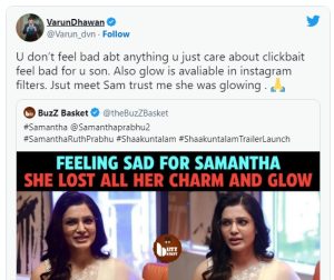 इस पर अभिनेता वरुण धवन ने ट्रोल को शानदार तरीके से जवाब दिया। उन्होंने लिखा, ‘आप किसी भी चीज के बारे में बुरा महसूस नहीं करते हैं। तुम्हें बस लोगों को गिराकर अपनी ओर सबका ध्यान खींचना आता है। बेटा… आपके लिए खराब लग रहा है। ग्लो तो इंस्टाग्राम फिल्टर्स में भी मौजूद है। अभी सैम से मुलाकात हुई, मेरा यकीन मानो वह काफी ग्लोइंग हैं।’