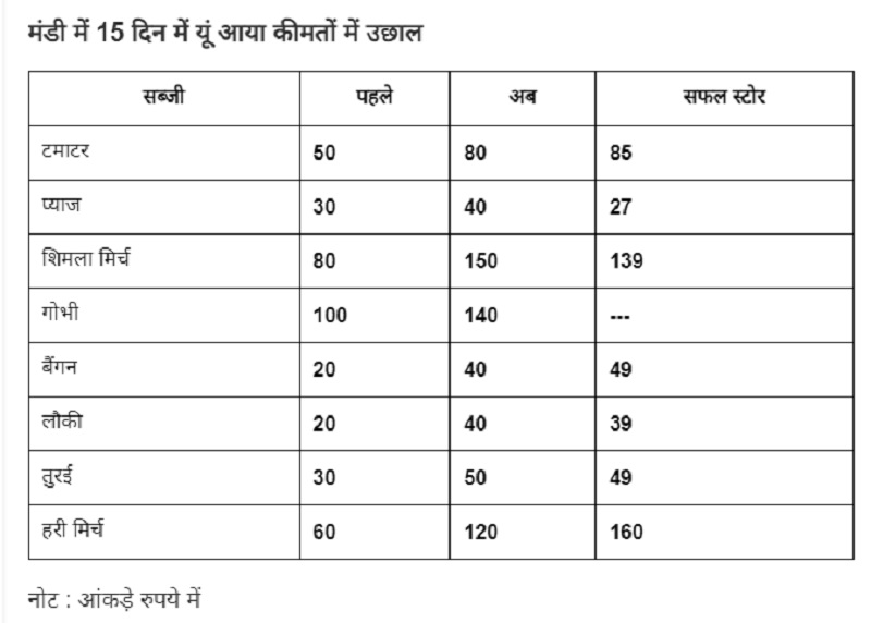 वहीं, सब्जियों के खुदरा कारोबारी नितेश कुमार ने बताया कि शिमला मिर्च की कीमतें सबसे ज्यादा बढ़ी हैं। इनकी कीमत 150 रुपये प्रति किलोग्राम तक पहुंच गई है। इनके अलावा हरी मिर्च, लौकी, तुरई, बीन्स, गोभी, हरा धनिया की कीमतों में भी 50 से 100 फीसदी तक की बढ़ोतरी हुई है।