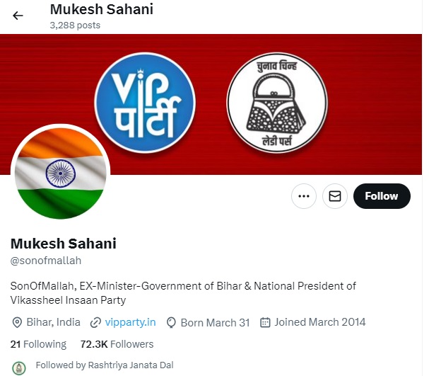 मुकेश सहनी ने अपना प्रोफाइल फोटो बदलकर तिरंगे की तस्वीर लगाई