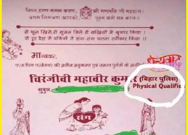 सोशल मीडिया साइट इंस्टाग्राम पर पोस्ट किए गए इस कार्ड में बाकी जानकारी तो सामान्य तरीके से ही लिखी हुई हैं लेकिन दूल्हे के नाम के आगे उसकी योग्यता को भी खासतौर पर बताया गया है। कार्ड में दूल्हे का नाम महावीर प्रसाद लिखा गया है जिसके पीछे बिहार पुलिस लिखा गया है इसके ठीक नीचे अंग्रेजी में फिजिकल क्वालिफाइड लिखा हुआ है। इसके साथ ही दुल्हन का नाम कुमारी लिखा हुआ है। हालांकि पोस्ट में यह साफ नहीं है कि इसमें दुल्हन की योग्यता कुछ लिखी थी या नहीं।