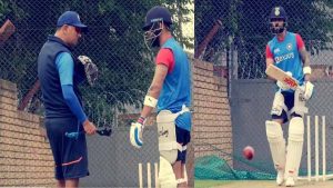 भारत कप्तान विराट कोहली और राहुल द्रविड़ की जुगलबंदी देखते ही बन रही थी. दोनों में टीम की रणनीति को लेकर चर्चा हो रही है. नेट प्रैक्टिस के दौरान राहुल द्रविड़ भारतीय कप्तान विराट कोहली को टिप्स देते हुए देखे गए. कोहली के अलावा वो मोहम्मद शमी और रविचंद्रन अश्विन को भी बॉलिंग का अभ्यास करते हुए देखा जा सकता है. बीसीसीआई ने टीम इंडिया के ट्रेनिंग सेशन का एक वीडियो ट्विटर पर शेयर किया है. कोहली वीडियो के आखिरी में हाथ से इशारा करते हुए नजर आते हैं कि वो कितने जोश में हैं.