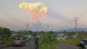 लेम्बाता। इंडोनेशिया (Indonesia) का माउंट लेवोटोबी लाकी (Mount Lewotobi Laki) ज्वालामुखी (Volcano) बुधवार को फिर से धधक उठा। इससे उठने वाली राख व धुएं का गुबार (Cloud of Smoke) आसमान में 10 किलोमीटर की ऊंचाई तक पहुंच गया। इसके कारण आसपास के गांवों को खाली कराना पड़ा गया। देश-विदेश से आये पर्यटक बाली द्वीप आने और जाने वाली उड़ानें रद्द होने से परेशान हो उठे। ज्वालामुखी में मंगलवार शाम से बुधवार दोपहर तक कई विस्फोटों के कारण राख आसमान में 5,000 मीटर तक फैल गयी।