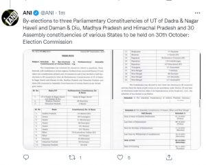 बता दें, केंद्र शासित प्रदेश दादरा एवं नागर हवेली व दमन एवं दीव के अलावा मध्यप्रदेश व हिमाचल प्रदेश की लोकसभा सीट पर उपचुनाव होने हैं। इसके अलावा अलग-अलग राज्यों की 30 विधानसभा सीटों पर भी उपचुनाव कराए जाने हैं।