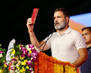राहुल गांधी ने संविधान की प्रति दिखाते हुए कहा कि यह चुनाव संविधान को बचाने का चुनाव है। संविधान को भाजपा और आरएसएस खत्म करना चाहती है, इसे बदलना चाहती है। कांग्रेस पार्टी और इंडिया गठबंधन संविधान की रक्षा कर रहा है। उन्होंने कहा कि जल, जंगल, जमीन का जो हक है, वह सब संविधान ने दिया है। मोदी सरकार आपके अधिकार को छीनना चाहती है, यह उनका लक्ष्य है। हम आदिवासियों, दलितों और पिछड़ों की भागीदारी बढ़ाना चाहते हैं। हमने फैसला किया है कि जातीय जनगणना कराई जाएगी। इससे देश की राजनीति बदलने जा रही है। इसके अलावा किसानों की कर्ज माफी की होगी। युवाओं को पहली नौकरी पक्की होगी, जिसमें एक साल तक साढ़े आठ हजार रुपये माह मिलेंगे।