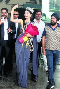 इन्दौर। इंदौर (Indore) की चेतना जोशी तिवारी (Chetna Joshi Tiwari) ‘मिसेज इंडिया 2023’ (Mrs. India 2023) का खिताब जीतने के बाद आज सुबह इंदौर लौटी, तो एयरपोर्ट (Airport) पर परिजनों सहित सैकड़ों ने पहुंचकर गर्मजोशी से चेतना का स्वागत किया। चेतना ने न सिर्फ खूबसूरती का बल्कि, अपनी बुद्धि का सर्वश्रेष्ठ प्रदर्शन करते हुए ये ताज अपने नाम किया है। श्रीलंका में आयोजित इस इवेंट में मलाइका अरोड़ा ने चेतना को ये ताज पहनाया था। चेतना ने कहा कि परिवार के साथ और आध्यात्मिक गुरु के आशीर्वाद से ये मिला।