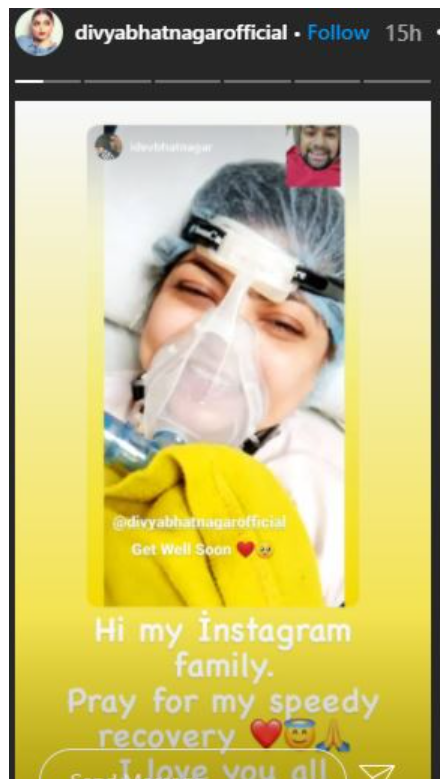 दिव्या ने इंस्टाग्राम पर अपने एक वीडियो का स्क्रीनशॉट शेयर किया था जिसमें लिखा था, ‘हाय…मेरी इंस्टाग्राम फैमिली…मेरी अच्छी सेहत के लिए दुआ कीजिए। आप सभी को प्यार।’