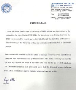 विज्ञप्ति के अनुसार, गांधी करीब एक घंटे तक डूसू कार्यालय में रहें, जिस दौरान सुरक्षाकर्मियों ने पूरे क्षेत्र को घेर रखा था. विश्वविद्यालय ने एक प्रमुख छात्र संगठन के कामकाज को बाधित करने के लिए इस दौरे की आलोचना की. विज्ञप्ति में कहा गया, “डूसू कार्यालय को सुरक्षा घेरे में ले लिया गया था और किसी को भी अंदर जाने की इजाजत नहीं थी. दिल्ली विश्वविद्यालय छात्र संघ सचिव को भी उनके कार्यालय में जाने से रोक दिया गया. विज्ञप्ति में दावा किया गया कि कुछ छात्रों को डूसू सचिव के कमरे में बंद कर दिया गया और एनएसयूआई छात्रों ने उनके साथ दुर्व्यवहार किया.