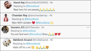 लोग सोनू सूद की मदद करने वाली अदा के कायल हैं. ट्विटर यूजर्स सोनू सूद के इस पोस्ट पर जमकर रिएक्ट कर रहे हैं और उन्हें रियल हीरो बता रहे हैं. एक यूजर ने कमेंट करते हुए लिखा, “लोगों के लिए असली हीरो.” दूसरे यूजर ने कमेंट किया, “मैन विद गोल्डन हार्ट.” एक और यूजर ने लिखा “आप भगवान के भेजे हुए हैं.” एक ऐसे ही और यूजर ने कमेंट किया, “आपको सलाम है सर.” सोनू सूद के इस ट्वीट पर लोगों के इस तरह के ढेर सारे कमेंट देखने को मिल रहे हैं.