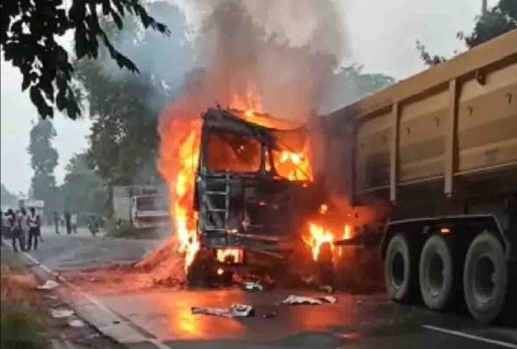 • बस-डम्पर की भीषण टक्‍कर से लगी आग, 12 यात्री घायल
