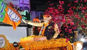 इंदौर। इंदौर (Indore) में पीएम मोदी का रोड शो (Indore PM Modi’s road show) शुरू हो गया है। बड़ा गणपति से रोड शो शुरू होने के बाद आधा किलो मीटर का सफर तय कर मल्हारगंज पहुंचा। प्रधानमंत्री नरेंद्र मोदी खुली जीप पर सवार हैं। वे दोनों हाथों से जनता का अभिवादन करते हुए चल रहे हैं। लोग उन पर फूल बरसा रहे हैं। मोदी के साथ जीप में भाजपा नेता वीडी शर्मा और मुख्यमंत्री शिवराज सिंह चौहान भी मौजूद है।