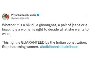 कांग्रेस नेता प्रियंका गांधी ने बुधवार सुबह ट्वीट करते हुए लिखा कि, “चाहे बिकिनी हो, घूंघट हो या जींस हो या हिजाब हो, ये महिला का अधिकार है कि वह तय करें कि उसे क्या पहनना है। भारतीय संविधान से हमें इसकी गारंटी मिली है। महिलाओं को प्रताड़ित करना बंद करें।” प्रियंका गांधी ने अपने ट्वीट में यूपी चुनाव के लिए कांग्रेस का नारा “लड़की हूं लड़ सकती हूं” का भी उपयोग किया है।