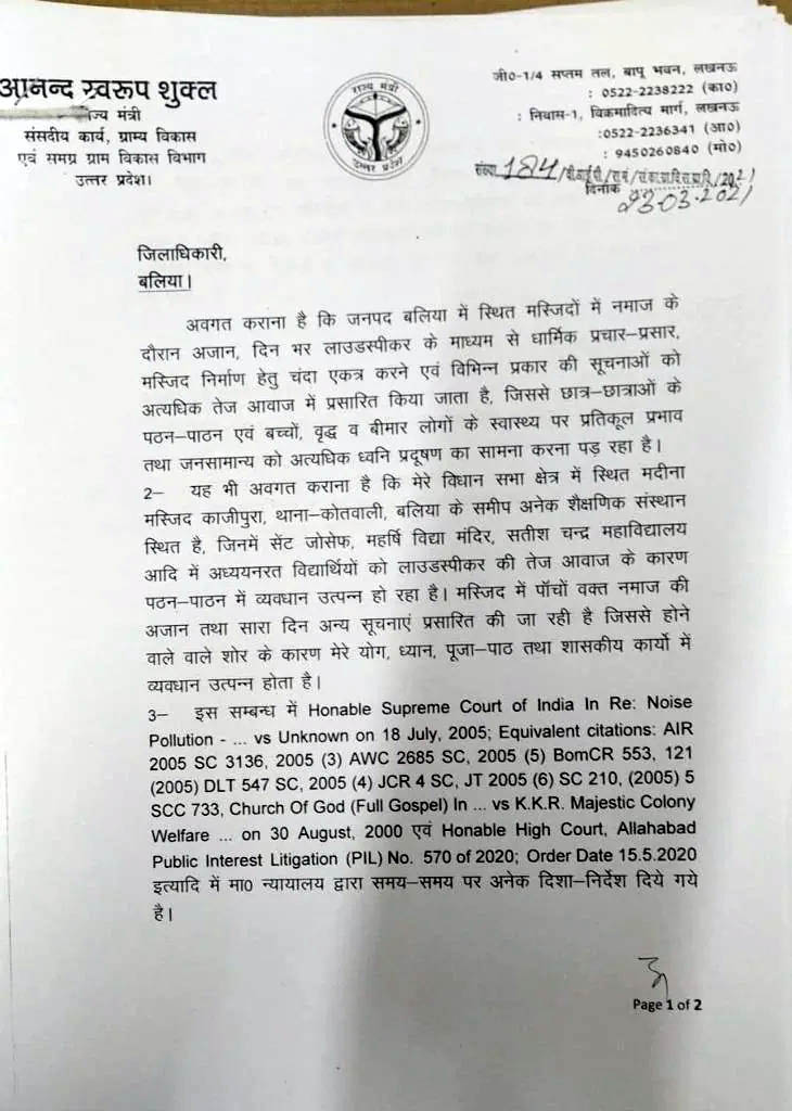 राज्यमंत्री आनंद स्वरूप शुक्ला ने पत्र में लिखा कि मेरे विधानसभा क्षेत्र में स्थित मदीना मस्जिद काजीपुरा जो कोतवाली थाना के अंतर्गत आता है उसके निकट कई शैक्षणिक संस्थान हैं इसलिए उनमें अध्ययनरत विद्यार्थियों को लाउडस्पीकर की तेज आवाज के कारण पठन-पाठन में परेशान खड़ी होती है.